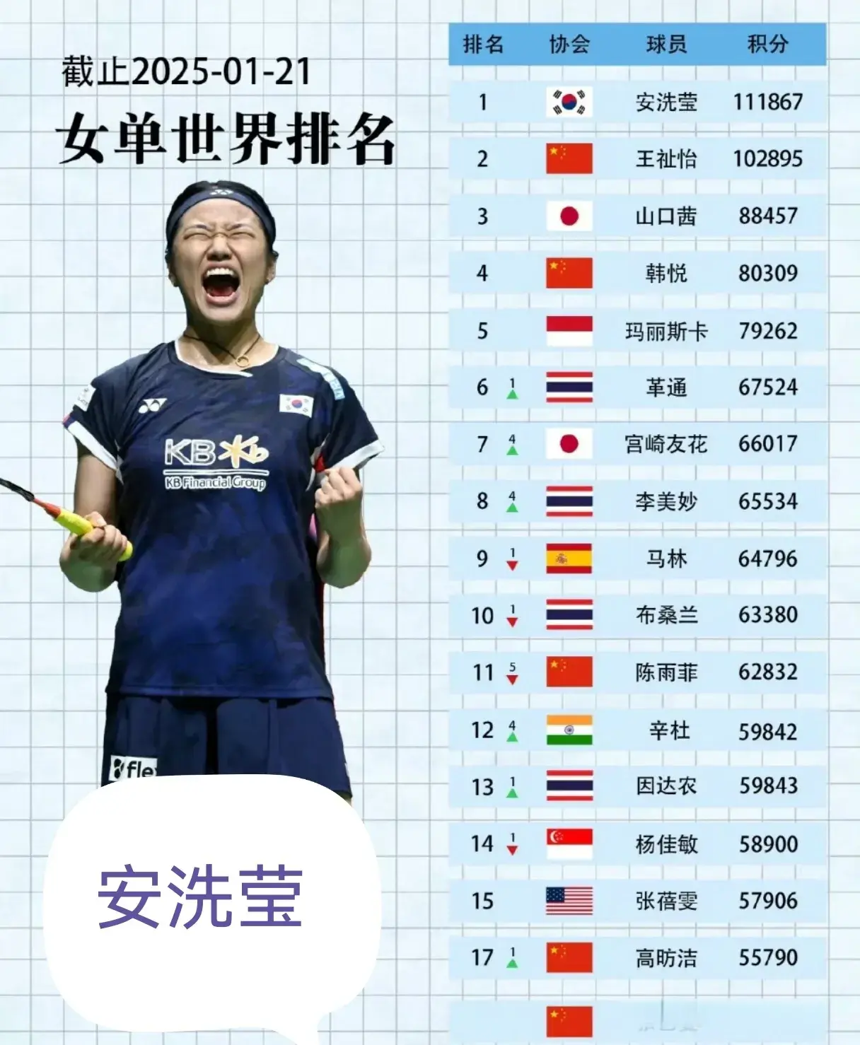 在女子单打方面。寰球排行第一的球员依旧是韩国东谈主安洗莹,这名球员亦然本赛季成绩了前两个分赛的一都冠军。中国的另外一位选手王祉怡当今排辞寰球的第二可惜在接下来的印尼公开赛亦然因为个东谈主的原因缺憾缺席而在本赛季他在二月份要点的比赛依旧是亚锦赛还期待能在亚锦赛的比赛当中夺得的奇迹生计第三个冠你好。日本的山口茜和中国的寒月紧随后来在本次最新的排行当中排在女子单打的第三和第四。此外印尼的玛丽斯卡和泰国的革通诀别排在第五和第六,而最新的寰球排行当中,陈雨菲由于在旧年的巴黎奥运会并莫得参加任何赛事,因此是寰球排行大幅下滑,当今最新排行一经跌到了第11。而第七和第八名亦然迎来了更迭日本的宫崎友花和泰国的李神秘亦然不休进步我方的战绩。