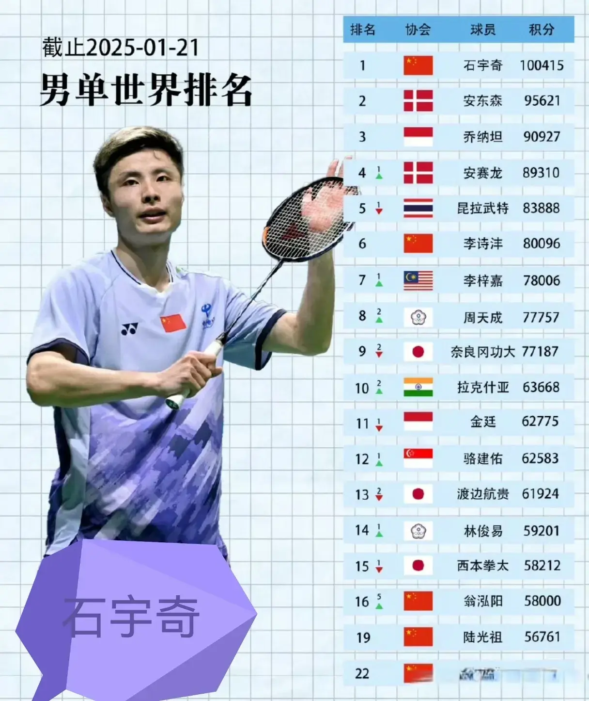 另外,在男人单打方面安赛龙凭借本赛季得回的印度羽毛球公开赛冠军寰球排行亦然从第五来到了第四。不外仍然是过时于前线的石宇奇,安东森和乔纳坦这三名球员。而本赛季安赛龙亦然期待能重新回到寰球第一的王座当中。而印度羽毛球公开赛进展不俗的翁泓阳晋级到了四强寰球排行飙升五位来到了寰球的前16。距离前线寰球第15的西本拳太亦然进出未几。