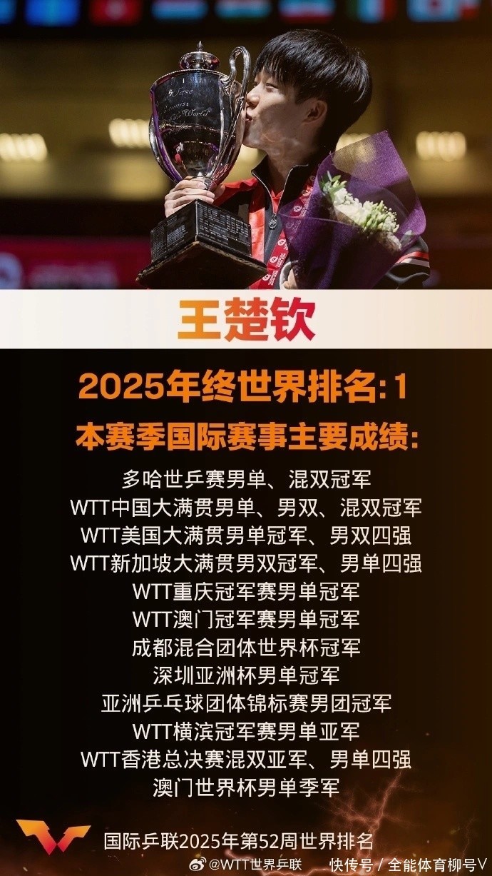 对此,球迷和网友纷纷点赞:“2025的王楚钦费劲啦!收成了很好的成绩,2026会更好!越来越好!”“恭喜王楚钦2025赛季15冠收官!2026年祝你带着喜爱与健康在赛场陆续大力张扬”“明慧的2025,王楚钦相配棒! 异日还很长,咱们陆续死力!”