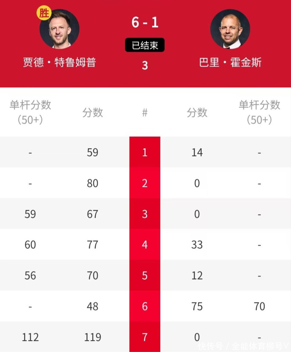 第一轮,特鲁姆普的敌手是巴里-霍金斯,此前的亚锦赛决赛,特鲁姆普也曾以10-8投诚霍金斯夺得冠军。来到大家赛,再次靠近霍金斯,这一次,他更所以6-1横扫敌手获取开门红。