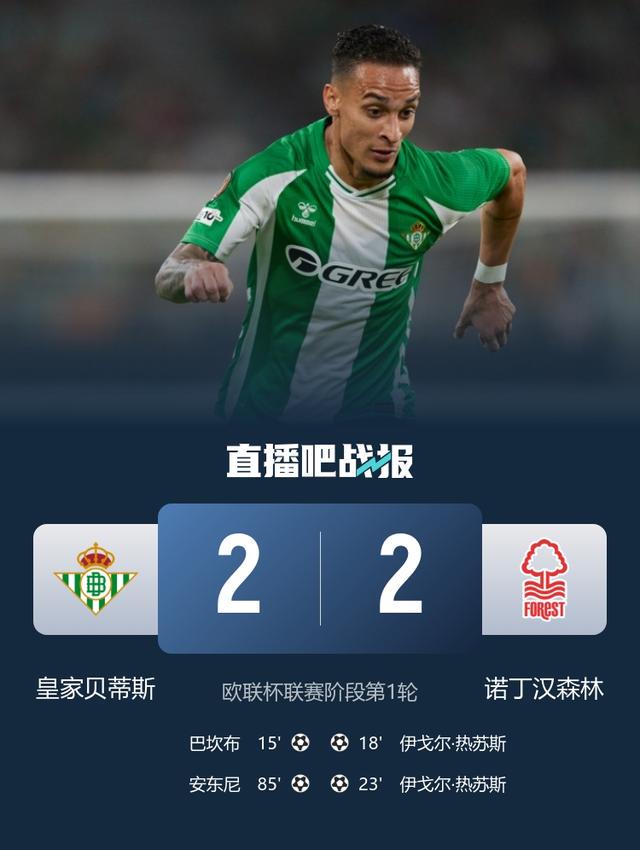 直播吧9月25日讯 北京时分3:00,欧联杯联赛阶段第1轮,皇家贝蒂斯vs诺丁汉丛林。上半场,安东尼助攻巴坎布破门;随后伊戈尔连入两球反超。下半场,安东尼85分钟绝平!最终,皇家贝蒂斯1-1战平诺丁汉丛林!