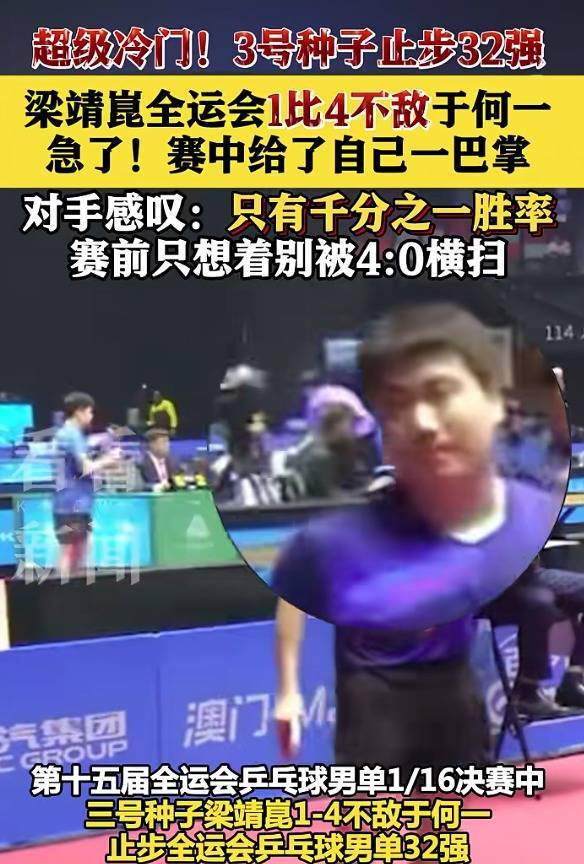 11月11日晚体育赛事直播,第十五届全运会乒乓球男单1/16决赛,河南队00后选手于何一发达惊艳,以4比1打败世界名交替六的国乒主力梁靖崑,到手晋级16强,爆出本届赛事大冷门。比分为11:6、11:7、9:11、11:3、15:13。