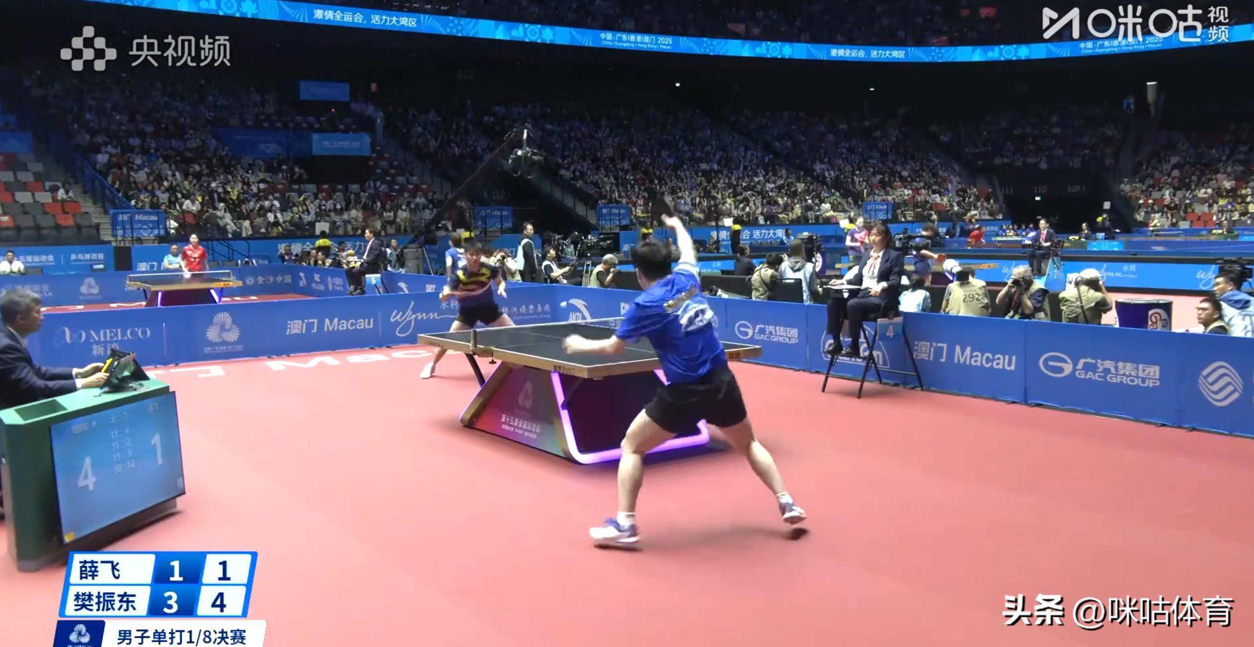 11月12日,2025全运会乒乓球男单1/8决赛,卫冕冠军樊振东迎来湖北队薛飞的挑战,最终以4-1的总比分胜出,顺利挺进八强。