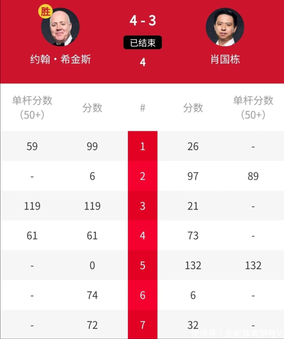 第四局和第五局,肖国栋轰出单杆132分,连胜两局之后,以3-2反超比分同期获取赛点,再胜一局就将晋级。不外,他错失好局,在拿到赛点的情况下莫得把捏好契机,被希金斯连扳两局,总比分3-4无缘小组决赛。