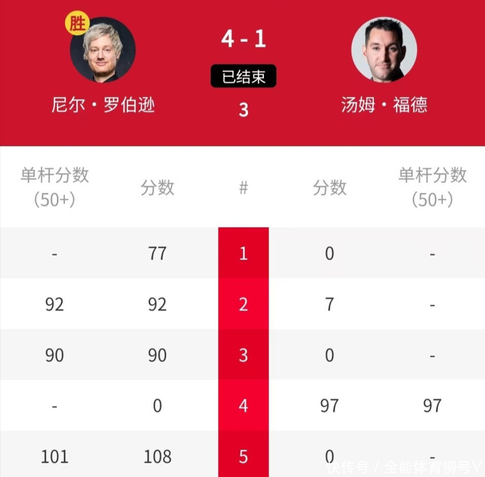 在罗伯逊与与福德的比赛中,他的弘扬绝顶出色,总比分4-1完胜晋级。这场比赛,希金斯轰出一杆破百(101分)和两杆50+(92分、90分),敌手福德只打出一杆50+。